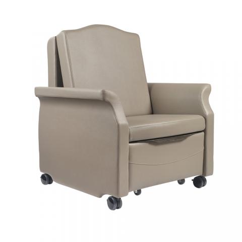 - Fauteuil lit pour accompagnant avec couchage monobloc et articulation permettant une conversion frontale facile de la position fauteuil en position lit.